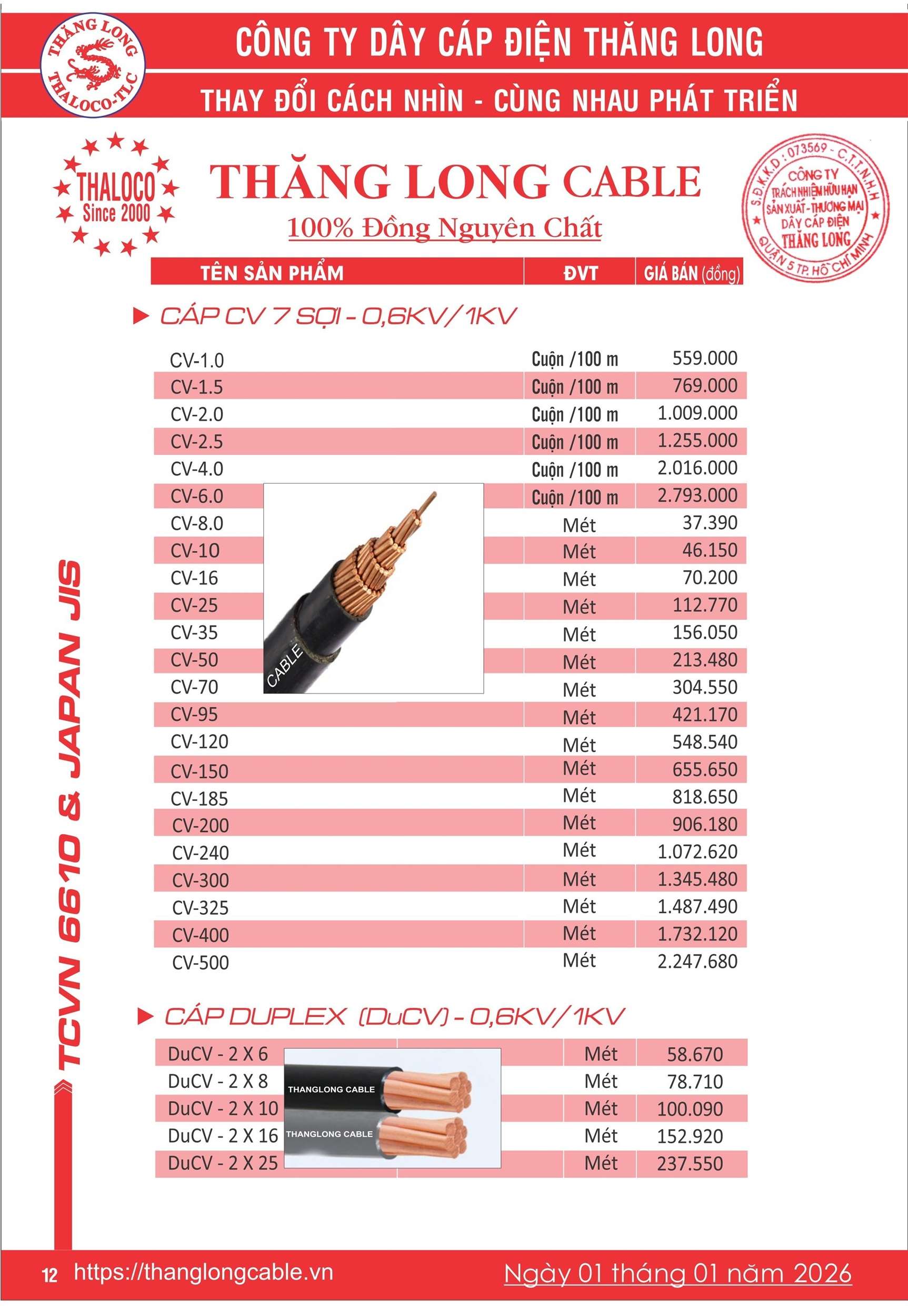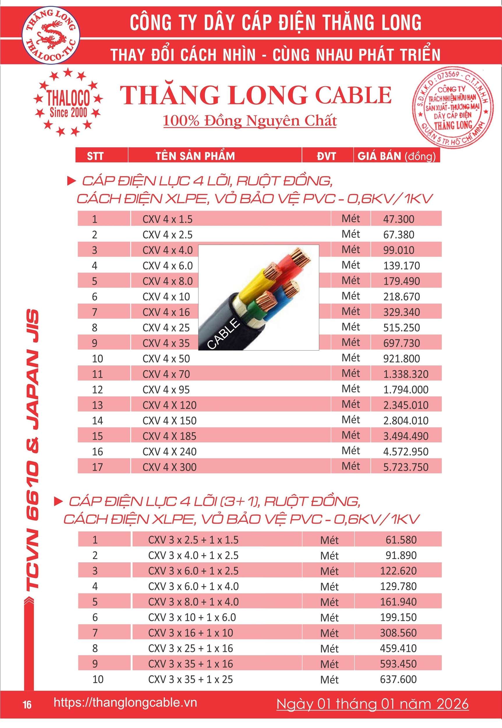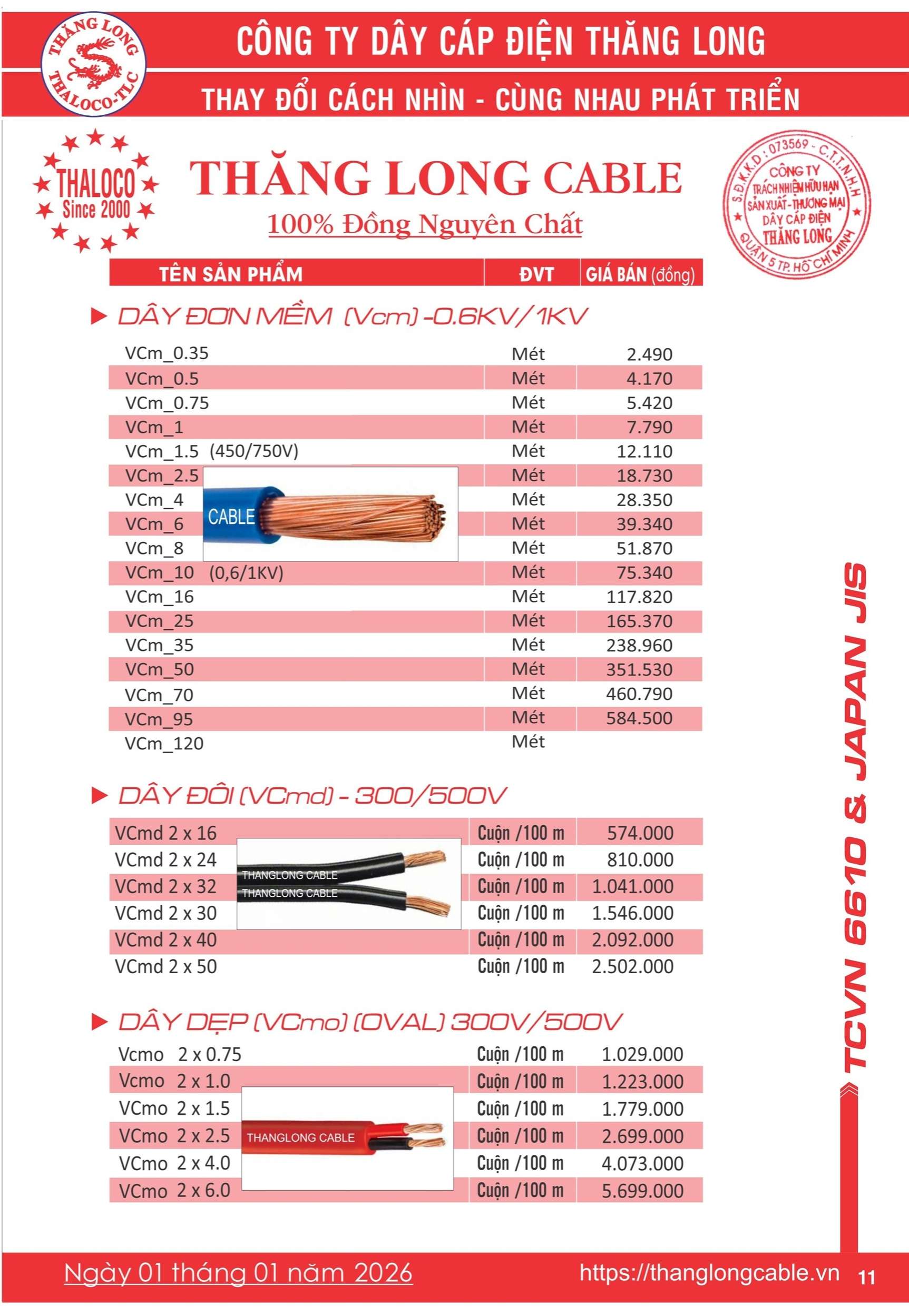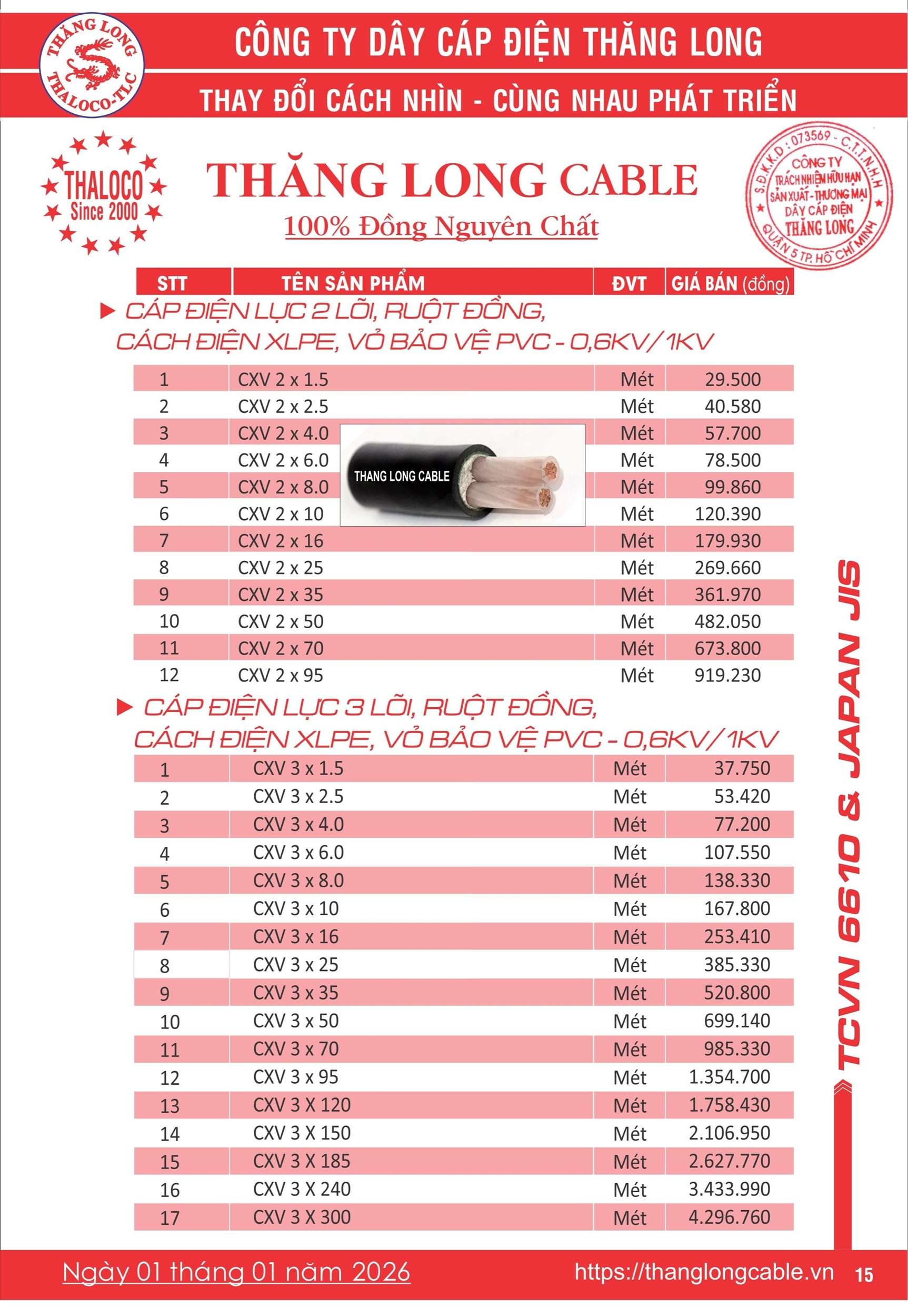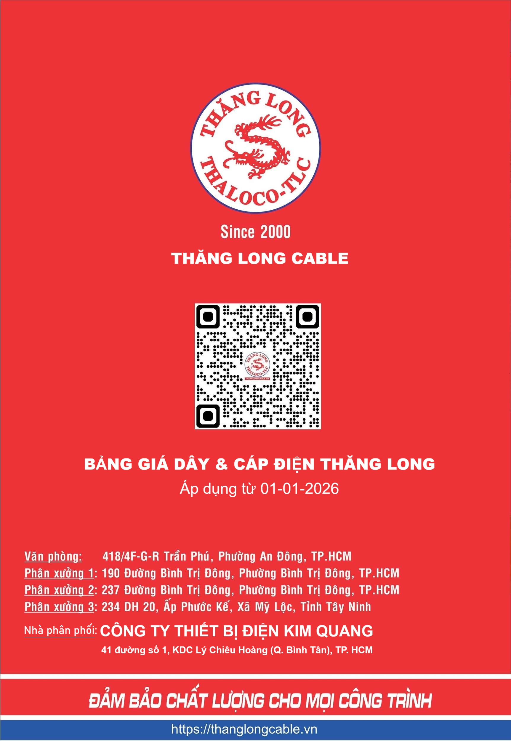Danh mục bảng giá dây cáp điện Thăng Long 1-2026
