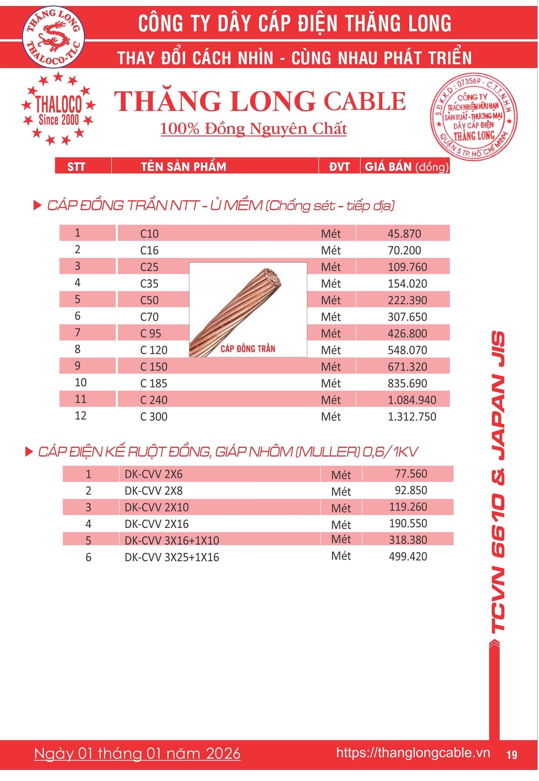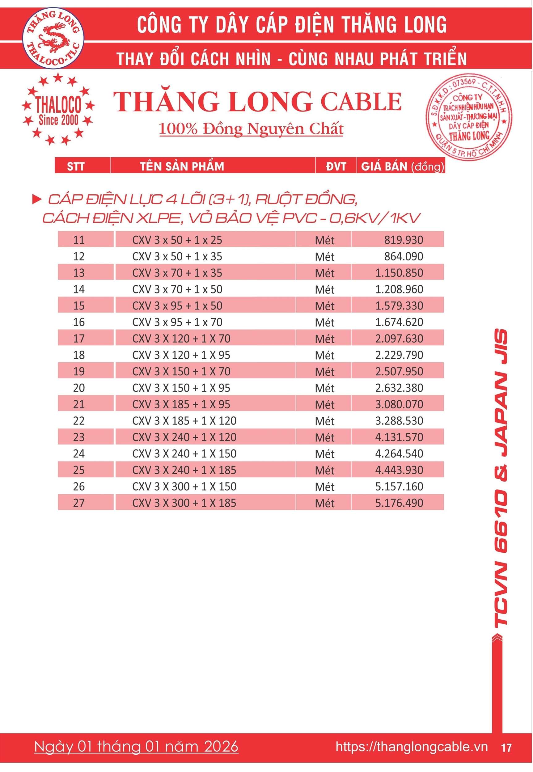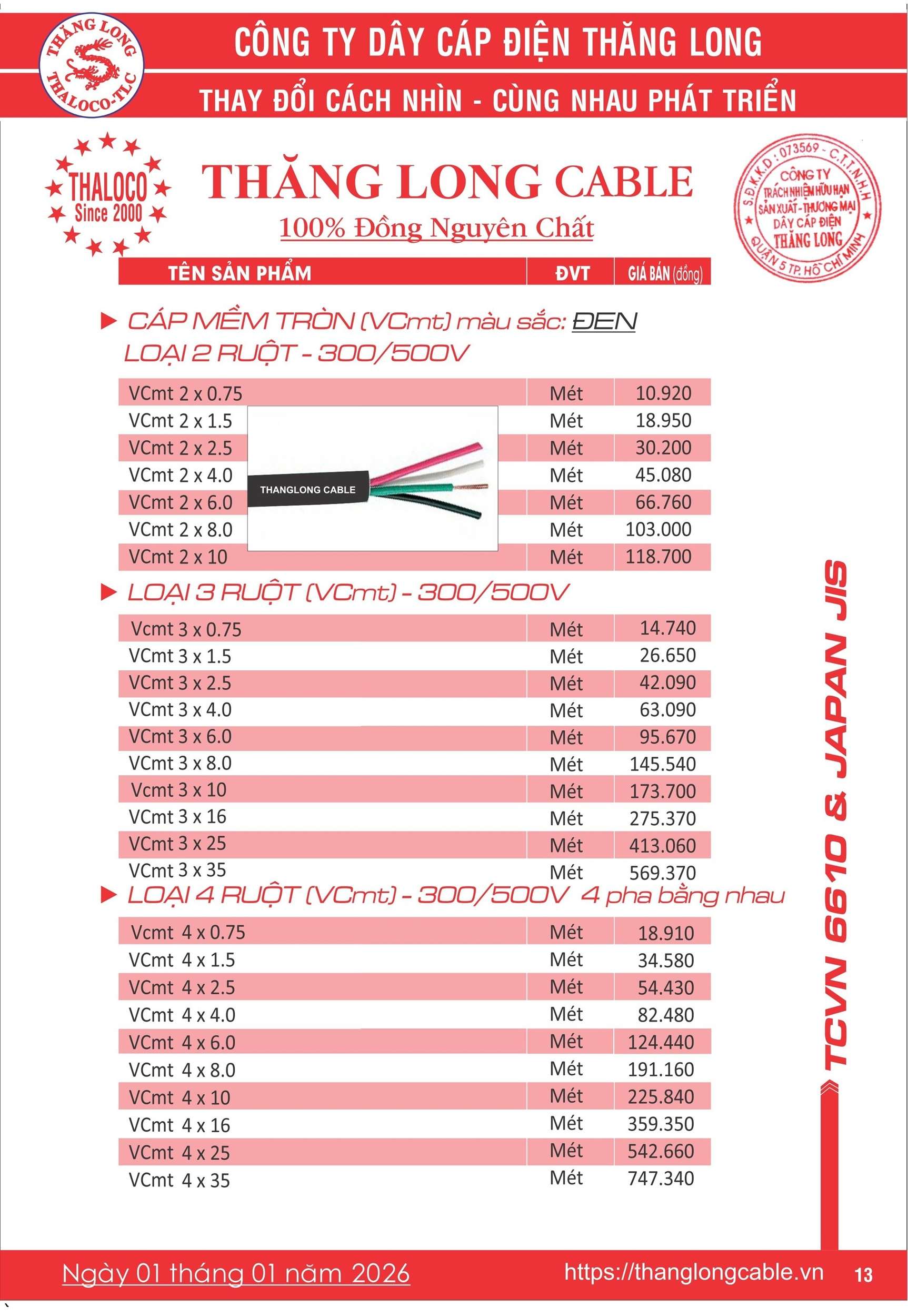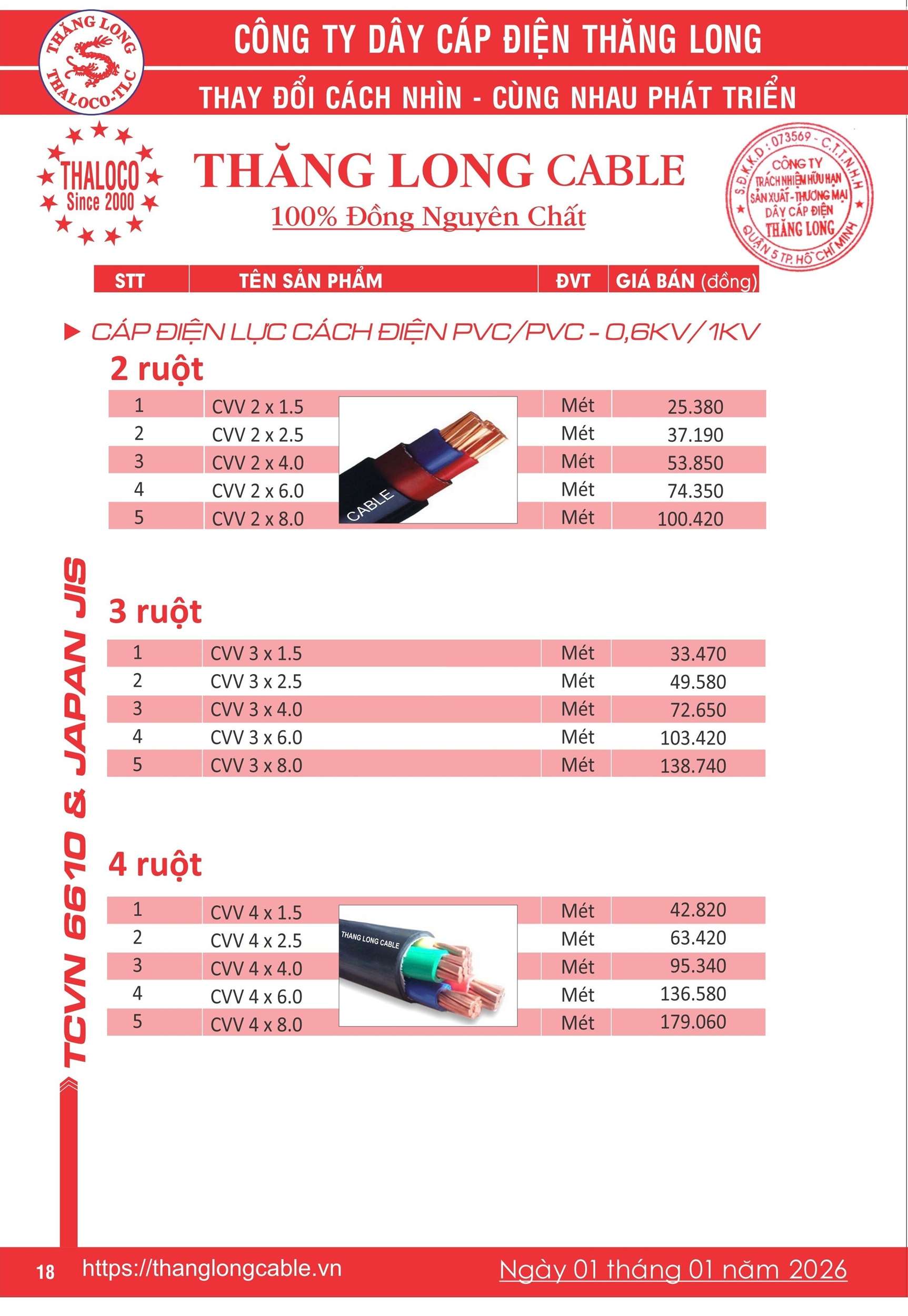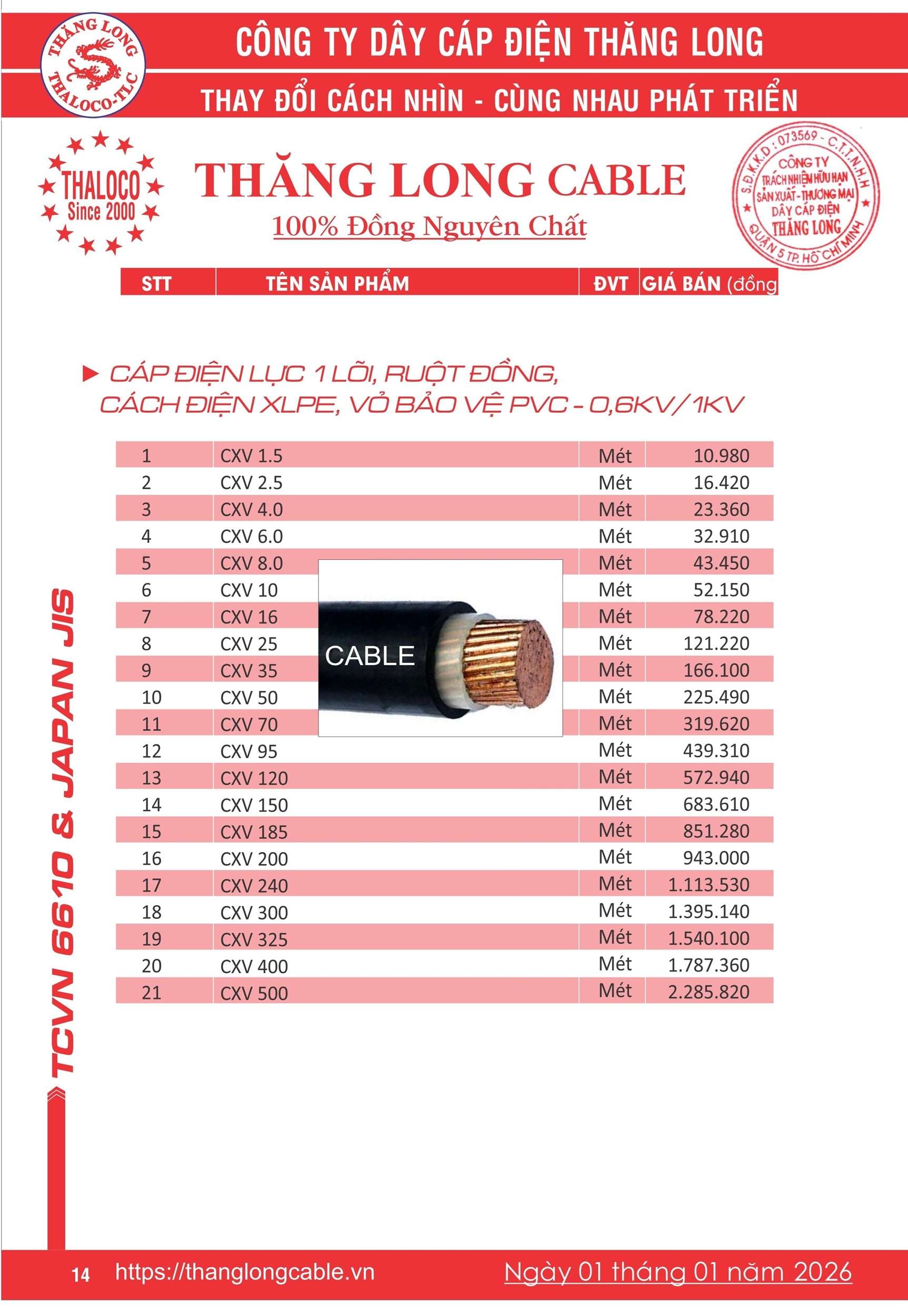 Danh mục bảng giá dây cáp điện Thăng Long 1-2026